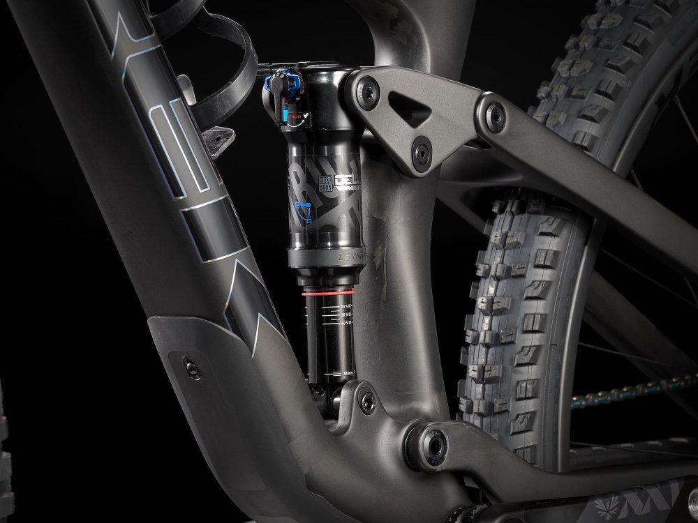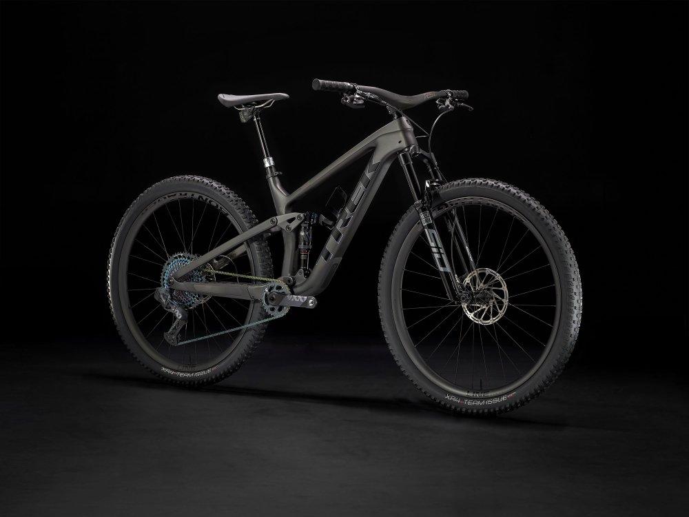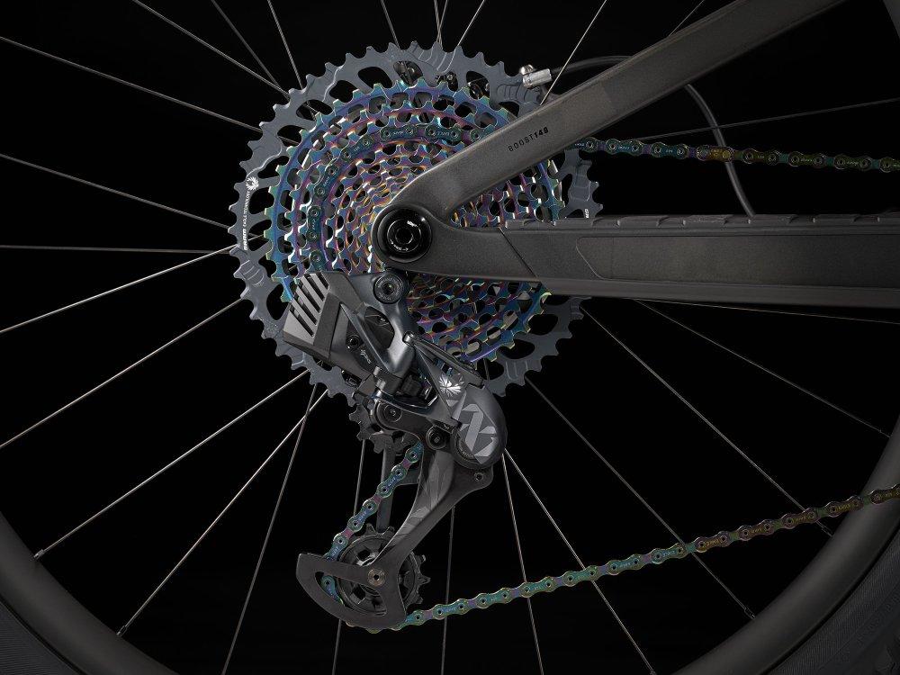 Einen Vollcarbonrahmen, eine extrem geschmeidig arbeitende RockShox SID Ultimate-Gabel mit 120 mm Federweg und Charger Race Day-Dämpfung mit vielen Anpassungsmöglichkeiten, einen RockShox Deluxe Ultimate RCT-Dämpfer mit 120 mm Federweg und einen komplett drahtlosen SRAM XX1 Eagle AXS-Antrieb. Dazu gibt es breite Bontrager Line Pro 30-Carbonlaufräder inklusive Rapid Drive-Nabe mit 108 Zähnen für einen verzögerungsfreien Kraftschluss, eine drahtlose RockShox Reverb AXS-Variosattelstütze und SRAM Level Ultimate-Scheibenbremsen mit Carbonbremshebeln.