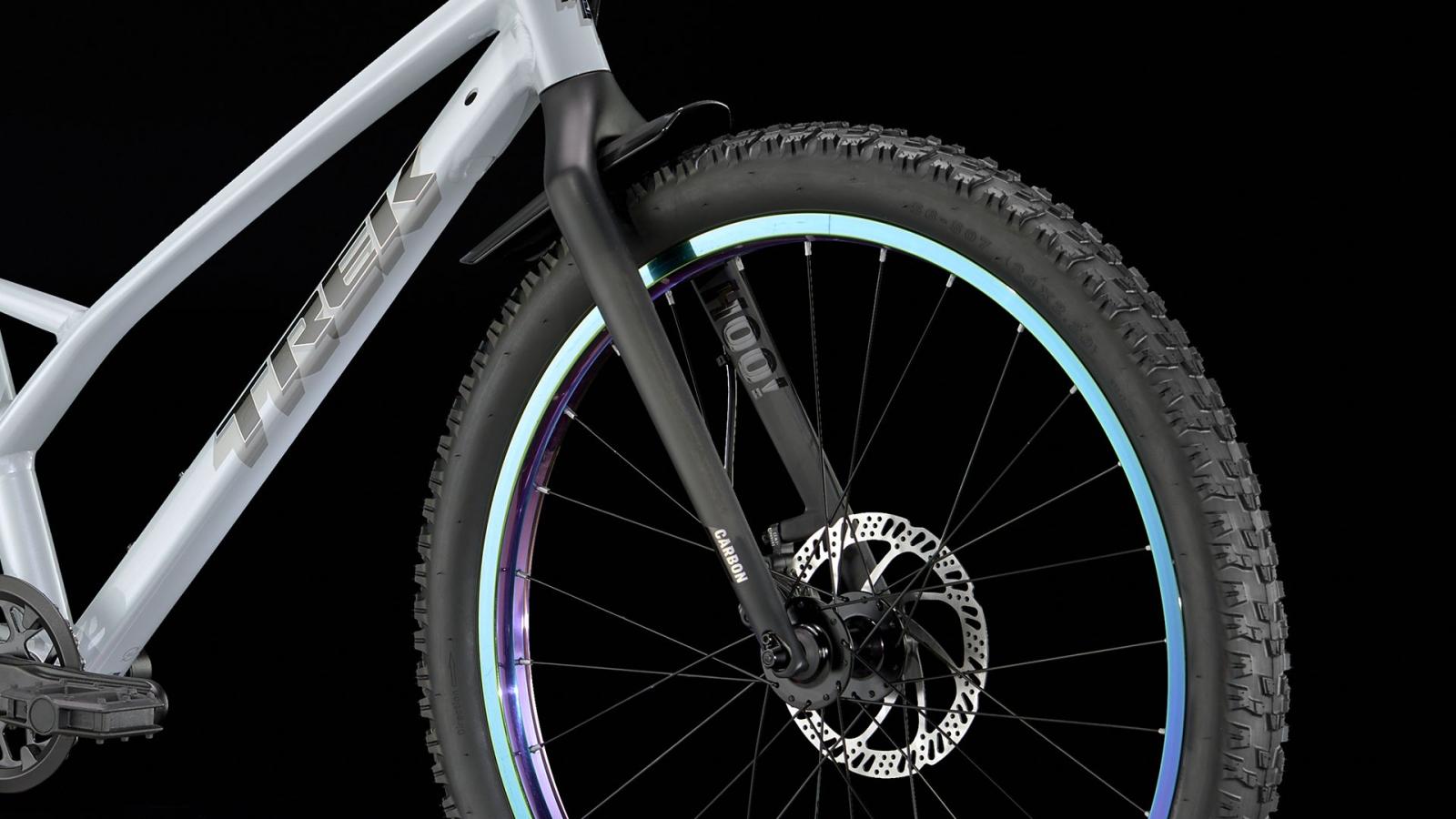 Einen Rahmen aus Alpha Silver Aluminium mit 24 Zoll gro�en Laufr�dern und griffigen, 2,4 Zoll breiten Stollenreifen, die sich im Untergrund festbei�en und ein Plus an Traktion bieten. Dazu gibt es eine speziell auf Kinderbed�rfnisse zugeschnittene Ausstattung, wie etwa die intuitive 9-Gang-Schaltung von microSHIFT und die kraftvoll zupackenden hydraulischen Scheibenbremsen.